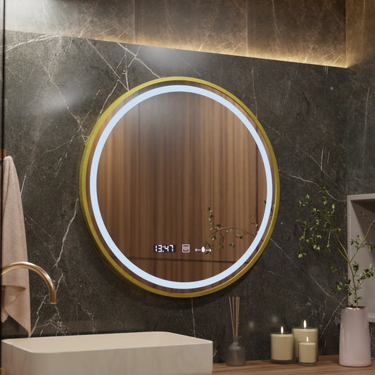 Oglinda LED Rotunda, 60cm, Celeste Royale Gold MotionGlow Marcello, Sistem Dezaburire, Ceas & Termometru, Dimabila