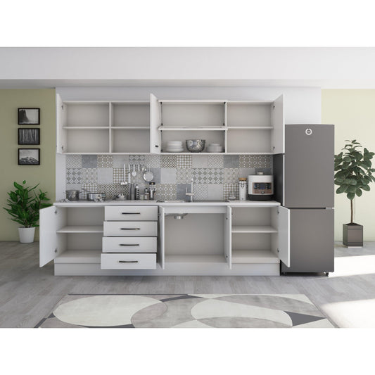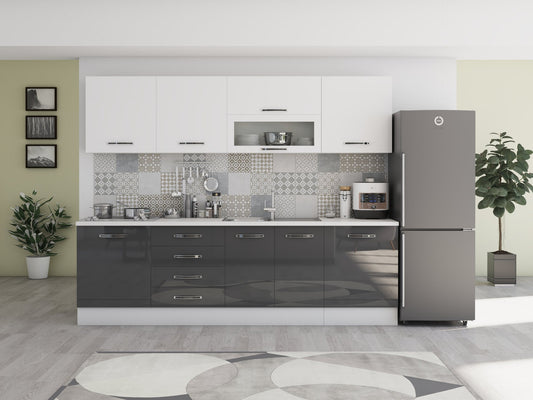 Bucatarie Alfa 260, Cu vitrina, Gri/Alb lucios, Blat termic