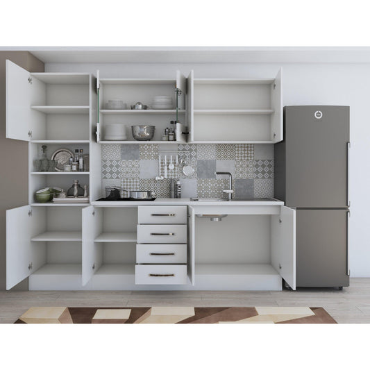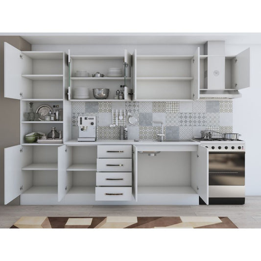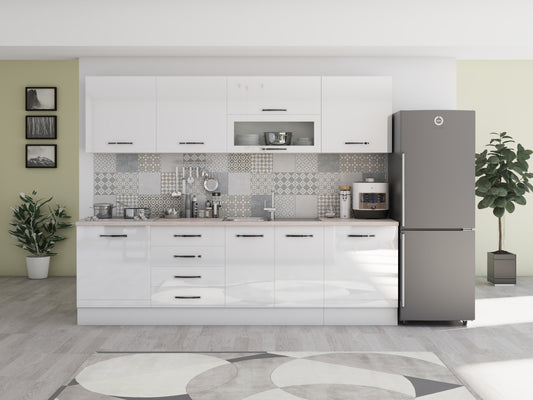 Bucatarie Alfa 260,alb-lucios cu vitrina, blat termic