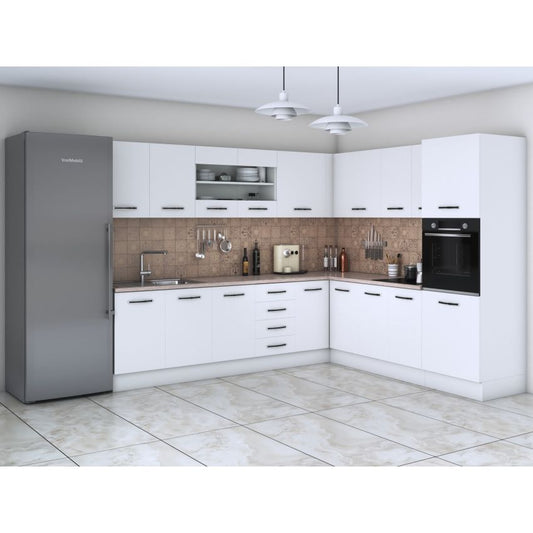 Bucatarie de colt Alfa, Corp inalt cuptor, Cu vitrina, Blat termic