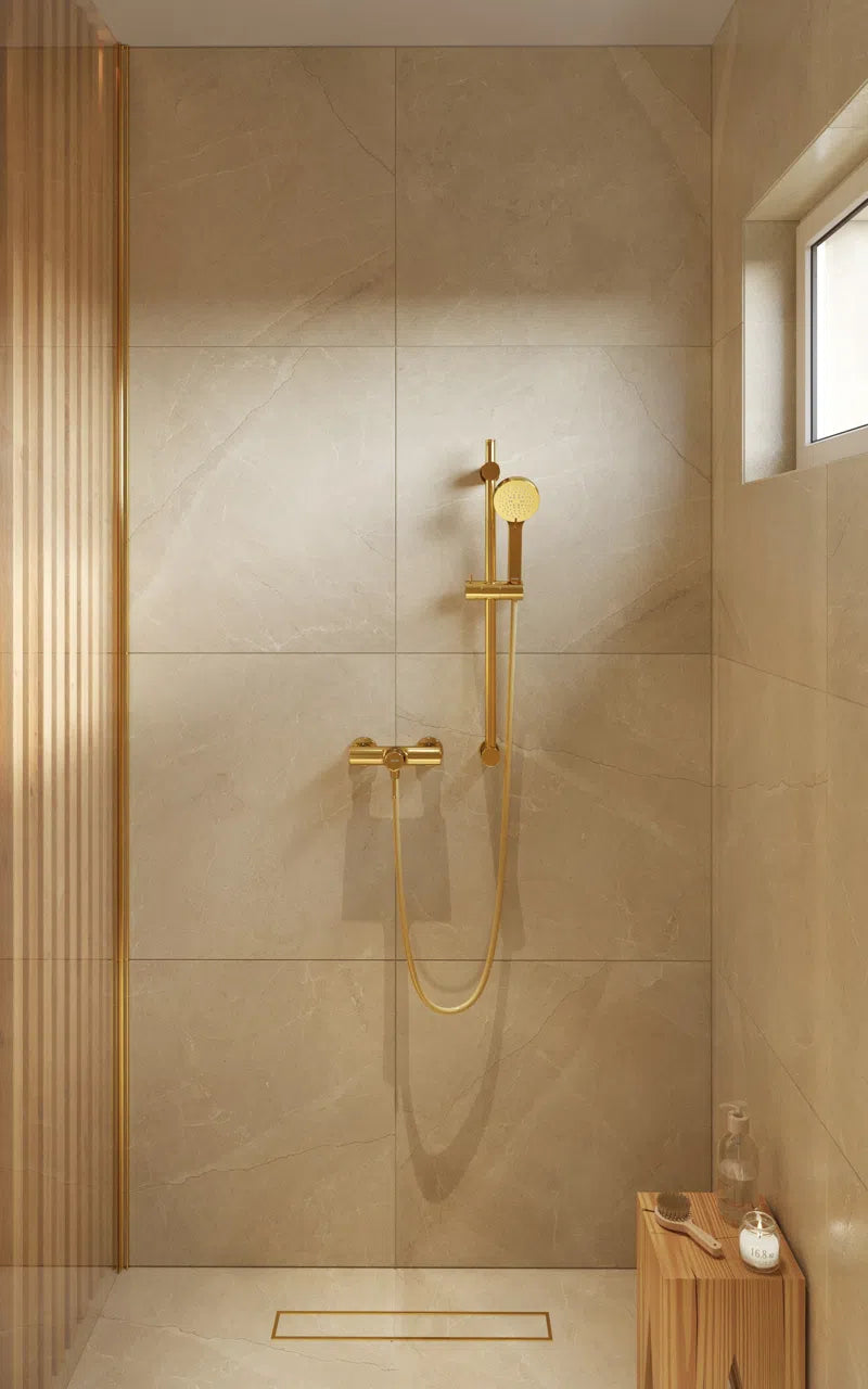 Aceasta baterie perete pentru dus este o alegere eleganta pentru o baie moderna, evidentiata prin finisajul auriu si designul compact. Constructia din alama asigura durabilitate si rezistenta in utilizare zilnica, iar cartusul ceramic ofera control precis al temperaturii si debitului de apa. Este potrivita pentru cabine de dus sau zone de dus walk-in. Produs disponibil in magazinul La Cucu.