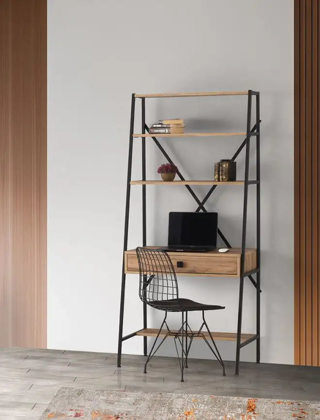 Sertarul integrat adauga un plus de utilitate si rafinament, fiind prevazut cu un maner tip buton, discret si elegant. Rafturile multiple permit depozitarea cartilor, decoratiunilor sau obiectelor de birou, pastrand un aspect ordonat si placut. Structura metalica solida ofera stabilitate, iar designul minimalist se potriveste perfect in orice amenajare moderna sau industriala.