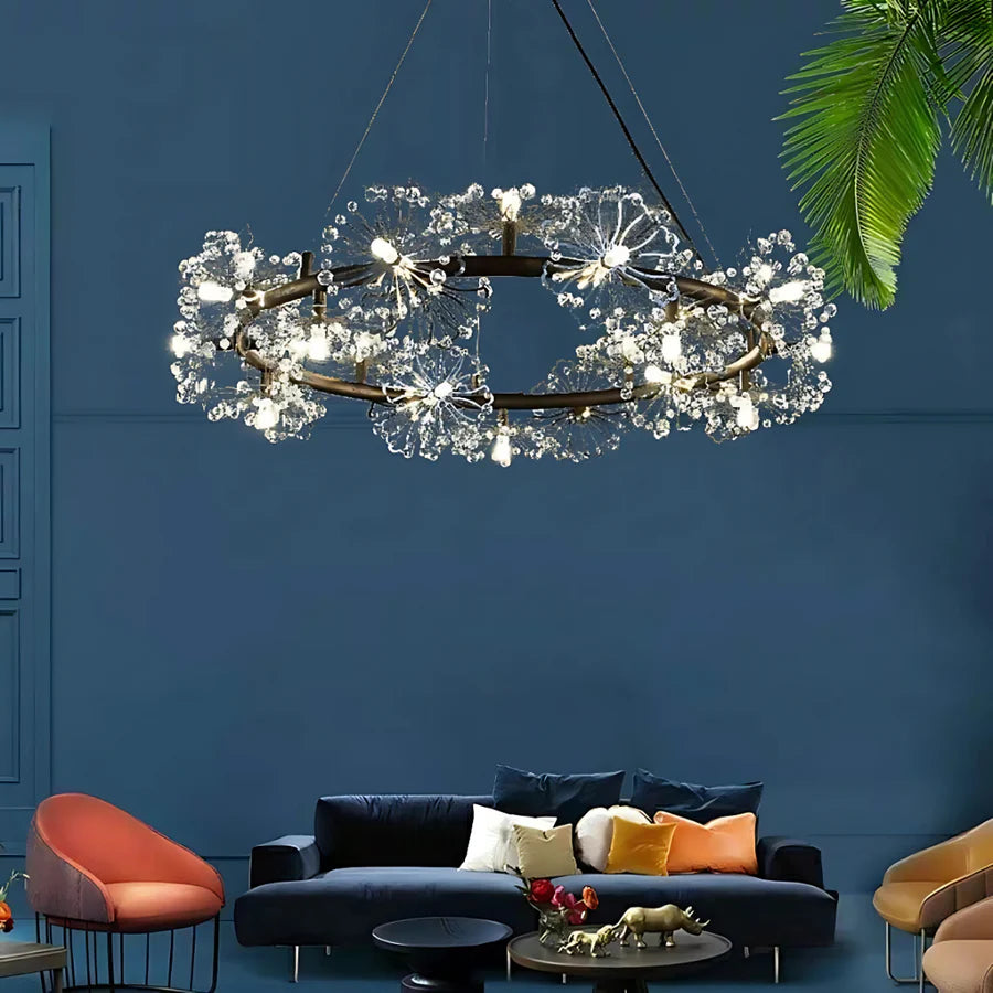 Candelabrul PETERHOF Magno impresioneaza prin designul sau floral unic, combinand structura metalica neagra cu elemente din cristal transparent sub forma de flori delicate. Cu diametrul de 62 cm si cele 25 de becuri G4, ofera o lumina calda si difuza, perfecta pentru living, dining sau dormitor. Eleganta cristalelor si contrastul cu finisajul negru transforma acest candelabru intr-un veritabil punct focal modern si sofisticat.
