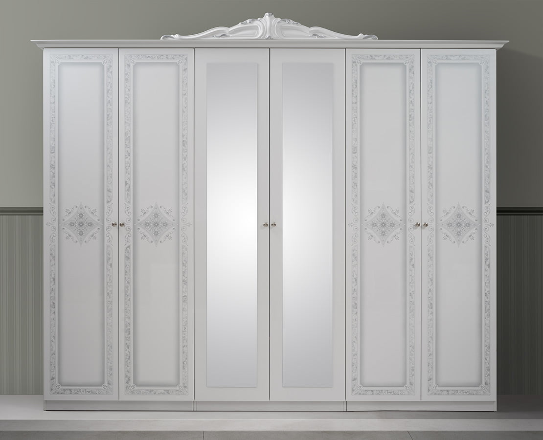 Dormitor Luisa, alb, pat 160x200 cm, dulap cu 6 usi, comoda, 2 noptiere, somiera metalica si saltea incluse