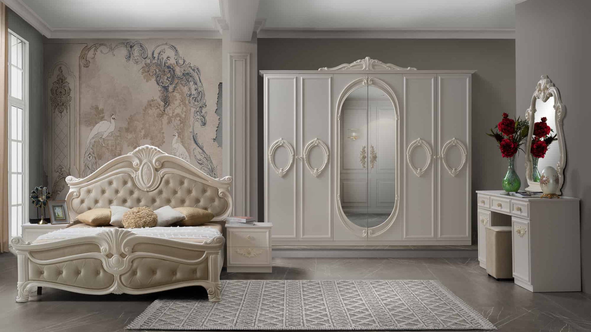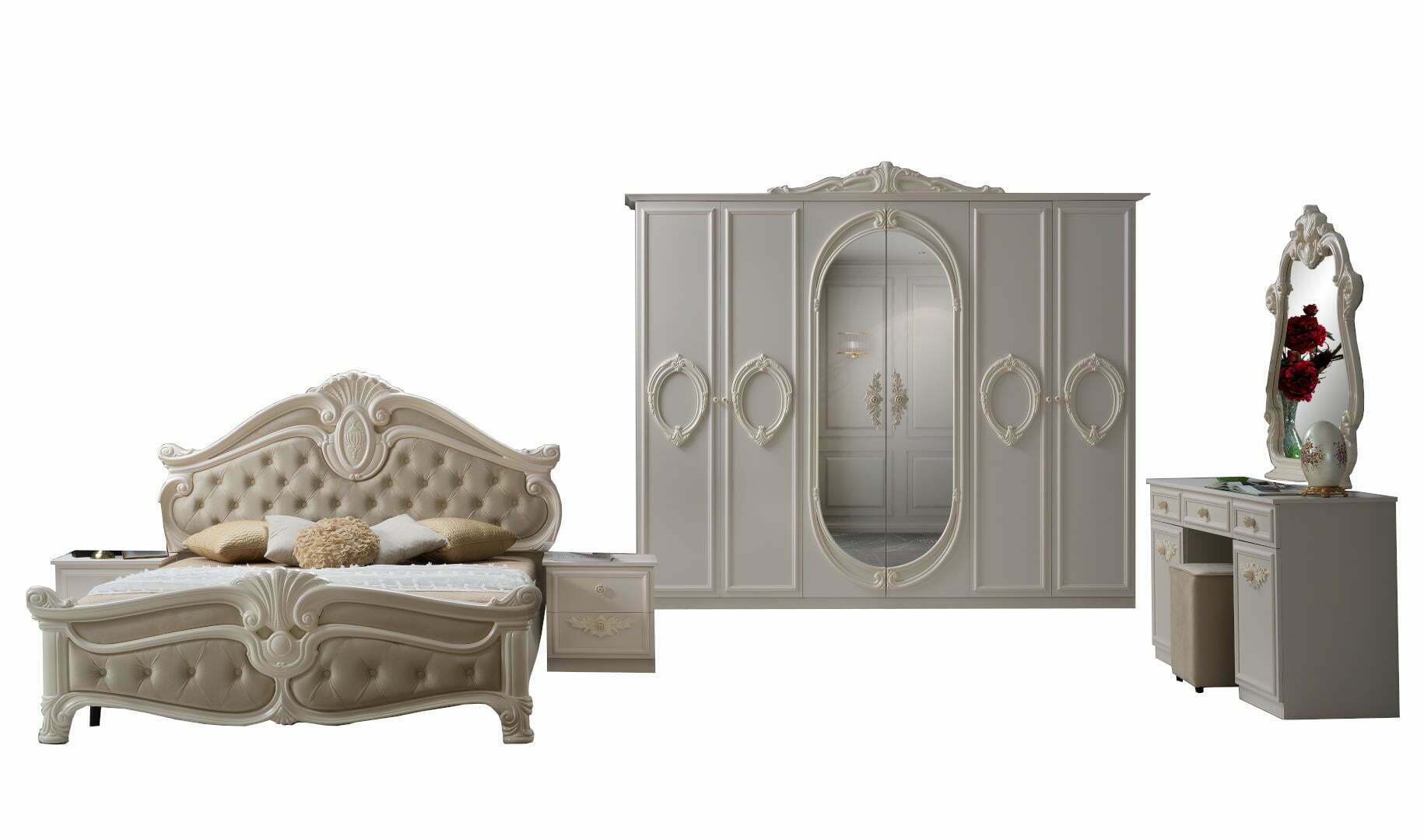 Dormitor Neli, crem, pat 160x200 cm, dulap cu 6 usi, comoda, 2 noptiere, somiera metalica si saltea incluse