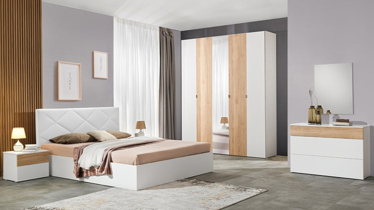 Patul asigura confortul necesar pentru un somn odihnitor, dulapul ofera spatiu amplu de depozitare, iar comoda si noptierele completeaza perfect functionalitatea dormitorului, pastrand ordinea si armonia in spatiu.