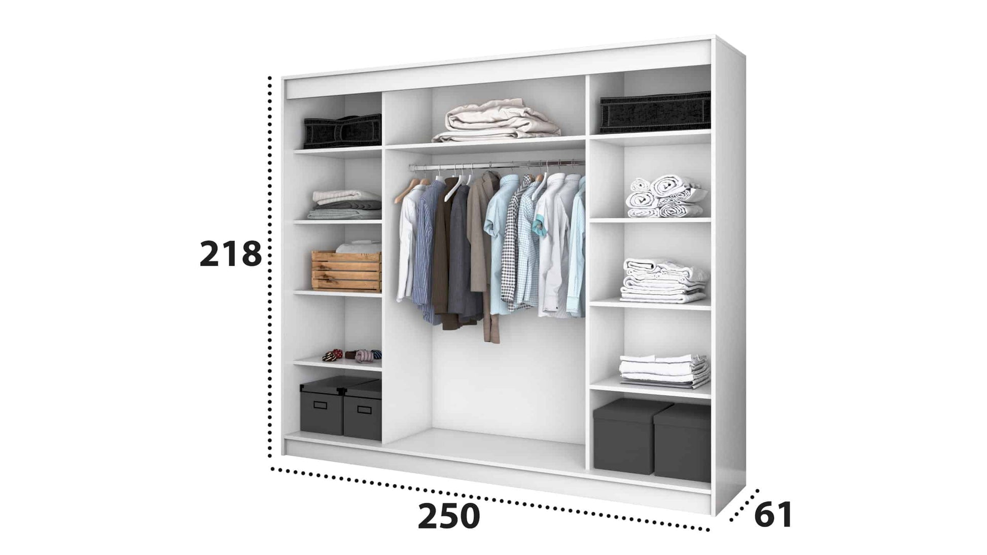 Cele 3 usi glisante asigura acces rapid si economisesc spatiu, iar oglinda centrala adauga luminozitate si creeaza senzatia unui spatiu mai mare. Compartimentarea inteligenta, cu 11 rafturi si o bara pentru haine, permite organizarea optima a garderobei, de la haine pliate la accesorii si articole pe umeras.