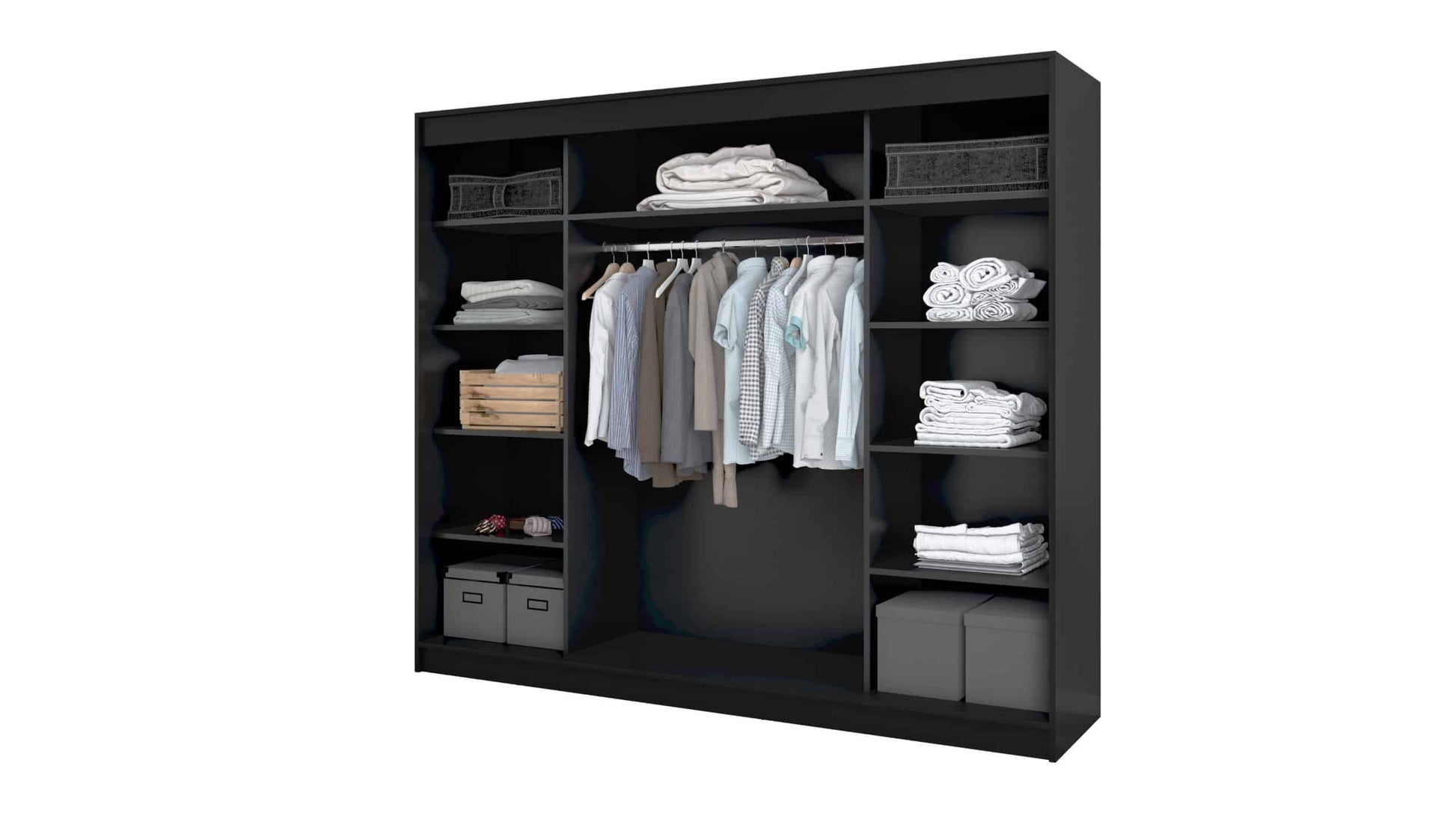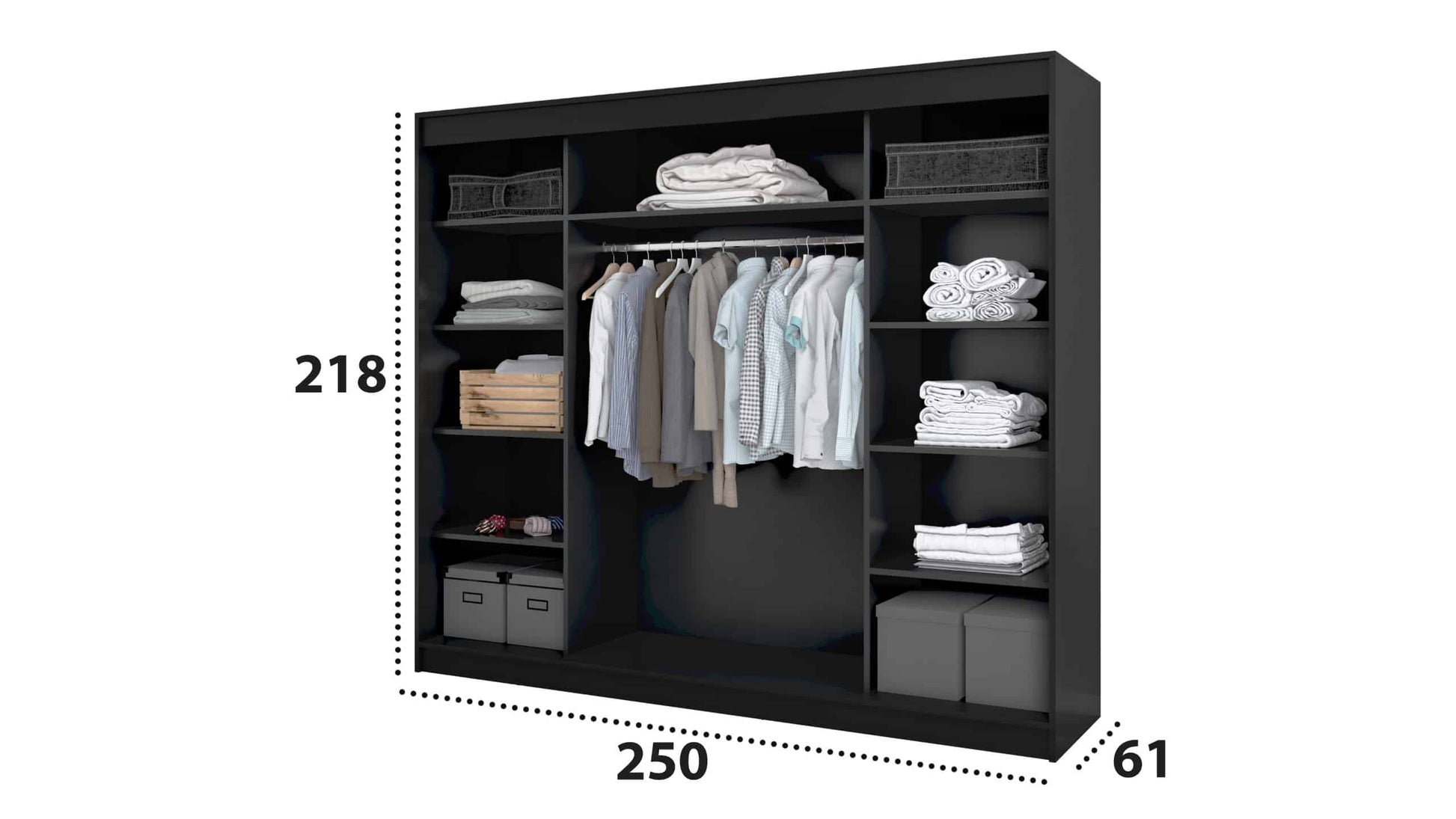 Realizat din PAL melaminat de 16 mm, cu margini ABS si ghidaje metalice pe rulmenti, dressingul ofera rezistenta sporita la uzura, umiditate si zgarieturi. Compartimentarea inteligenta cu multiple rafturi si bara pentru umerase permite organizarea eficienta a hainelor si accesoriilor. Finisajul negru aduce un plus de rafinament si creeaza o atmosfera luxoasa si moderna.