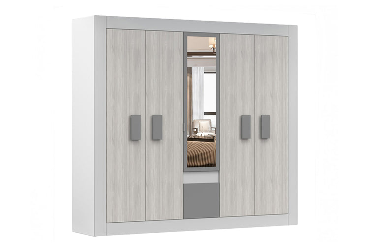 Dulap Valentin, Alb/Gri, cu oglinda, 233x210x57 cm, 5 usi