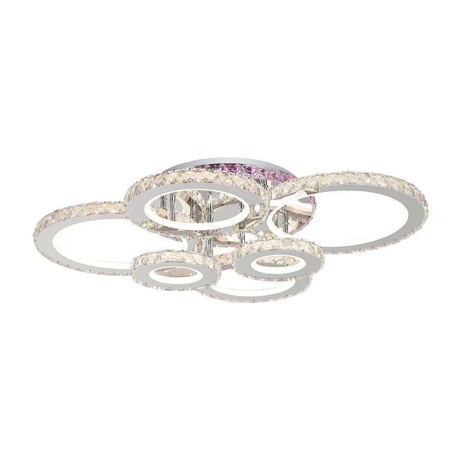 Lustra LED Nova Rotonda de la La Cucu imbina designul circular cu accente spectaculoase din cristal, oferind un iluminat versatil si o prezenta decorativa impresionanta. Cele 6 cercuri luminoase creeaza un efect vizual modern, iar finisajul crom lucios adauga un plus de rafinament oricarei incaperi.