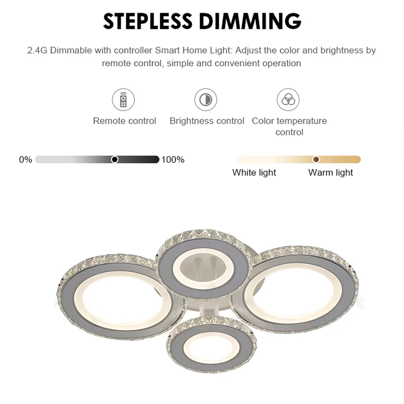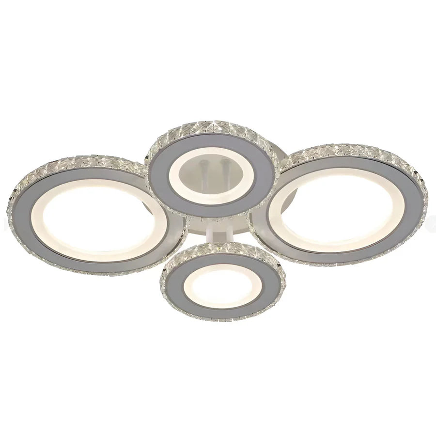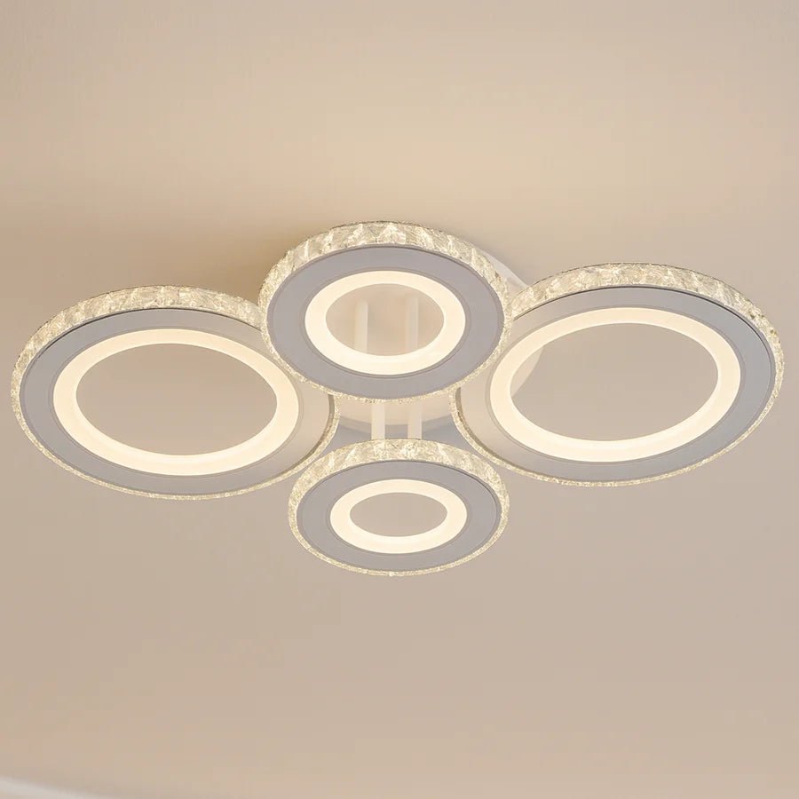 Aceasta lustra LED cu cristale si design rotund modern este alegerea ideala pentru spatii elegante si bine iluminate. Cele 4 cercuri creeaza un efect vizual spectaculos, iar functia RGB, impreuna cu reglajul de intensitate si temperatura de culoare, iti permite sa adaptezi atmosfera exact asa cum iti doresti. Controlul se face usor atat din intrerupator clasic, cat si prin telecomanda. Produs disponibil in magazinul La Cucu, potrivit pentru living, bucatarie sau dormitor.