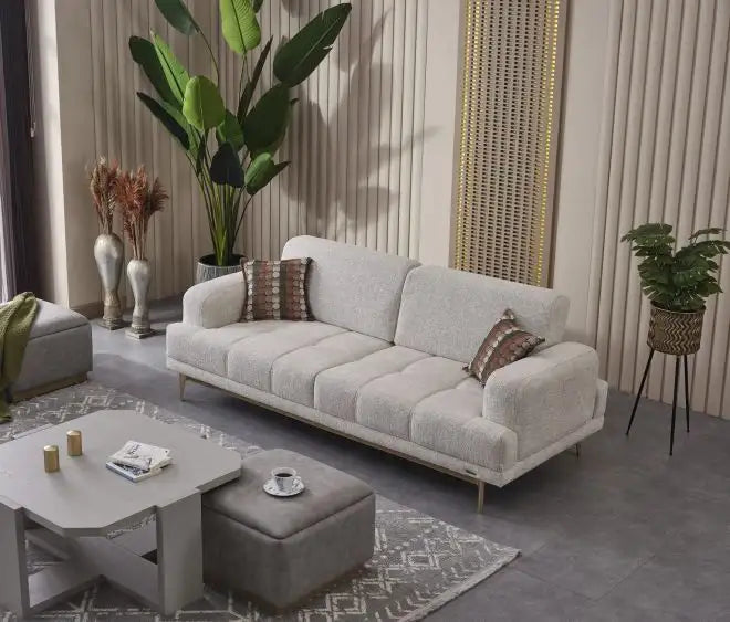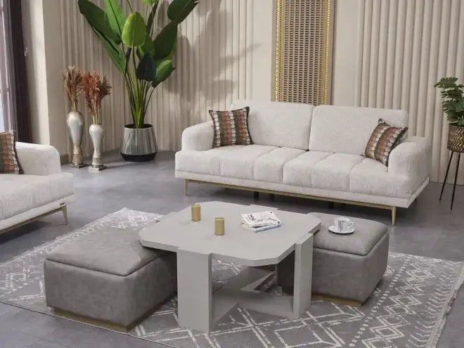Adauga stil si functionalitate in livingul tau cu masuta de cafea cu 2 tabureti Napoli, disponibila la La Cucu. Cu un design modern si linii curate, acest set aduce un aer elegant si echilibrat oricarei incaperi. Nuanta crem cald a blatului creeaza o senzatie placuta de armonie, potrivindu-se perfect atat in decoruri moderne, cat si in interioare clasice.