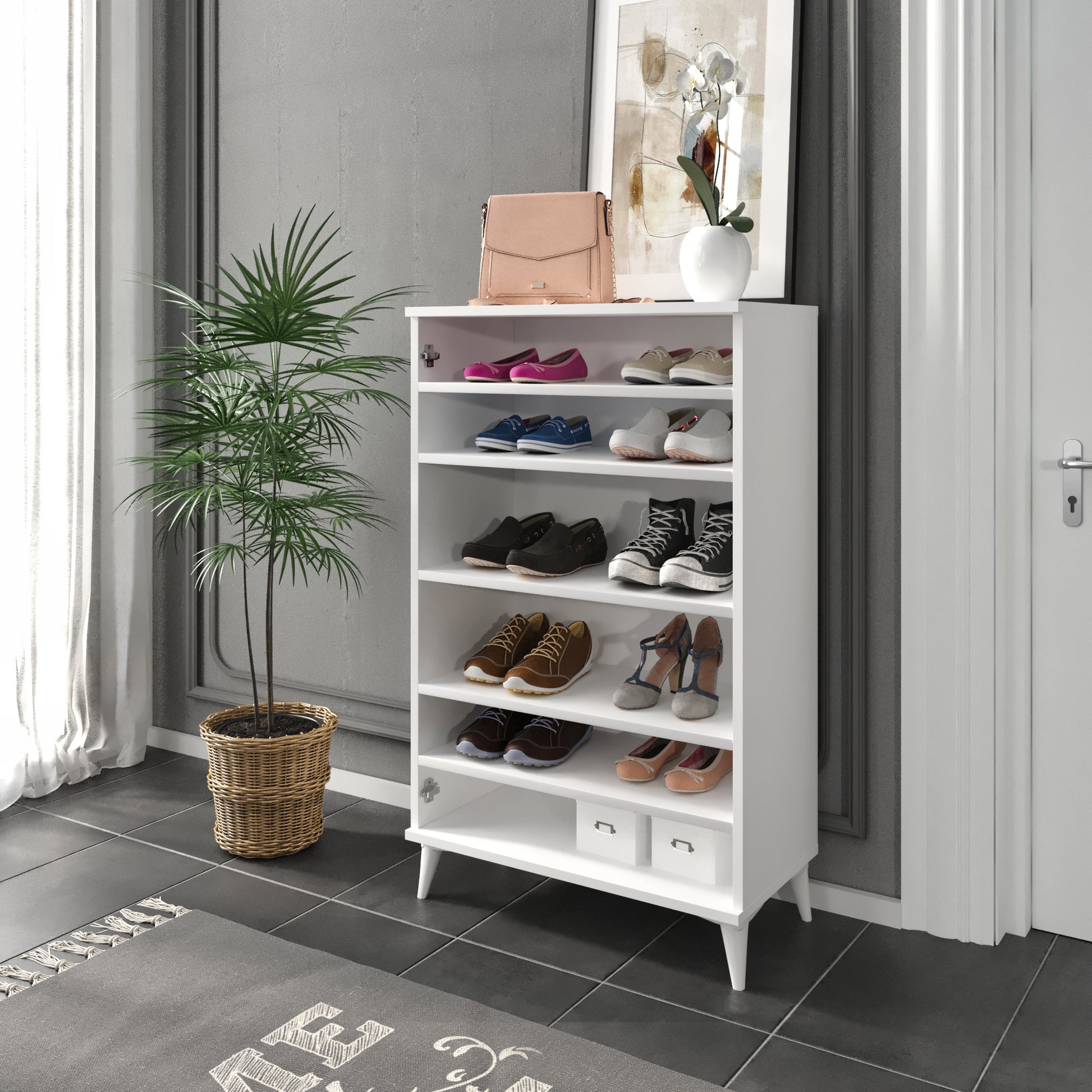 Pantofarul Fuga alb este solutia practica si eleganta pentru a pastra incaltamintea perfect organizata. Cu un design modern si compact, se integreaza usor in hol sau dressing, oferind un plus de ordine si stil locuintei tale.