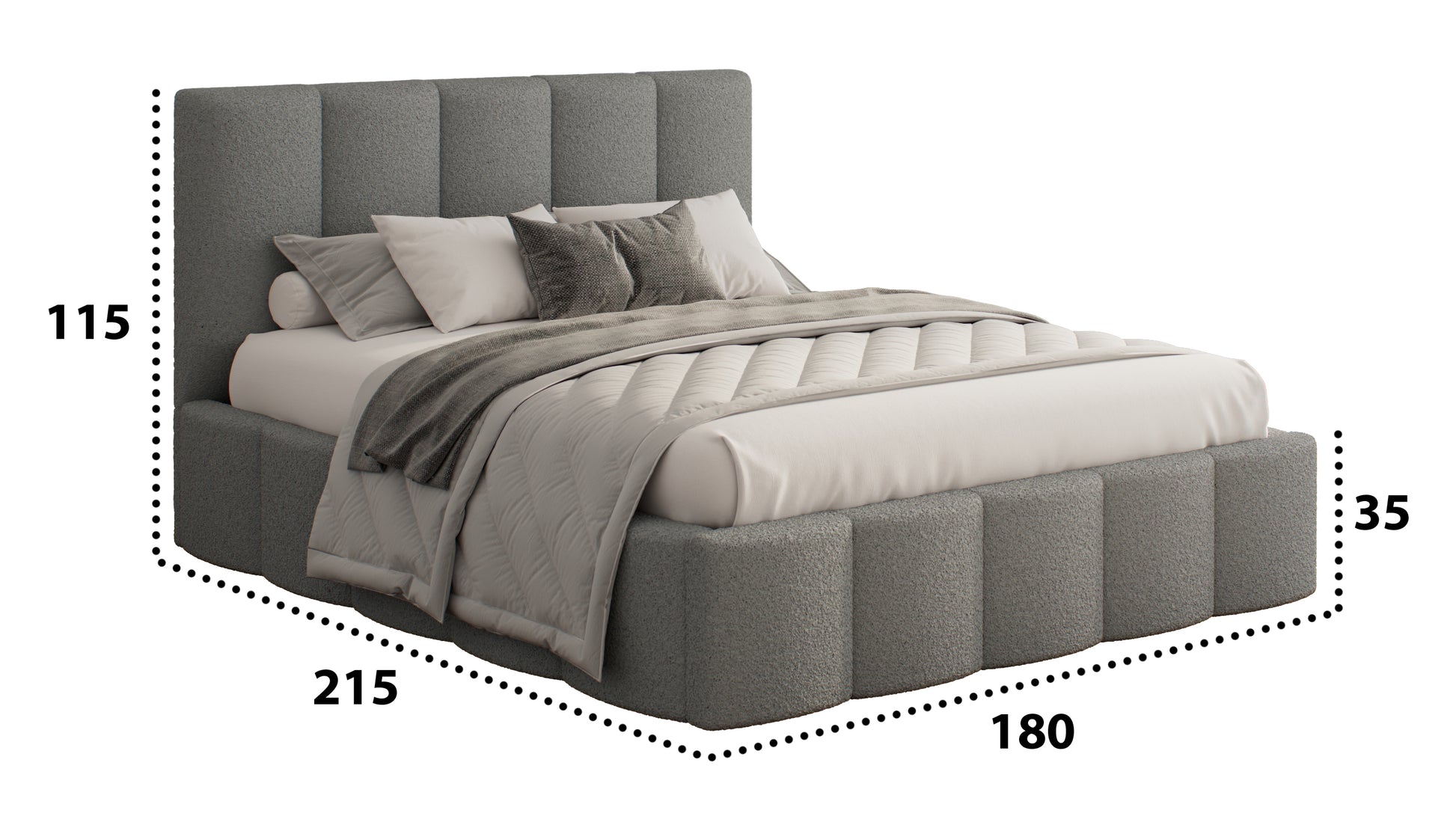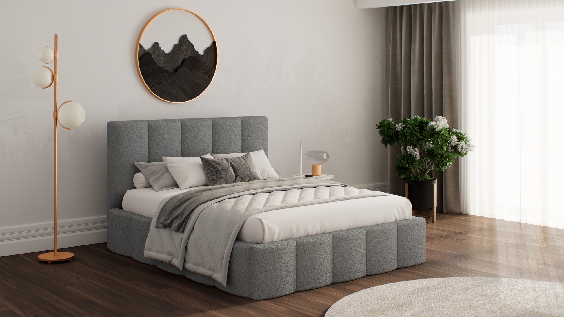 Patul Como 160x200 cm gri este alegerea perfecta pentru cei care isi doresc un dormitor modern, elegant si confortabil. Tapitat cu material textil boucle de inalta calitate si prevazut cu un strat generos de burete de 10 cm grosime, acest pat ofera atat un design sofisticat, cat si un nivel ridicat de confort. Dimensiunile sale il fac ideal pentru cupluri sau pentru cei care prefera un spatiu de odihna mai spatios.