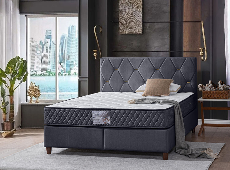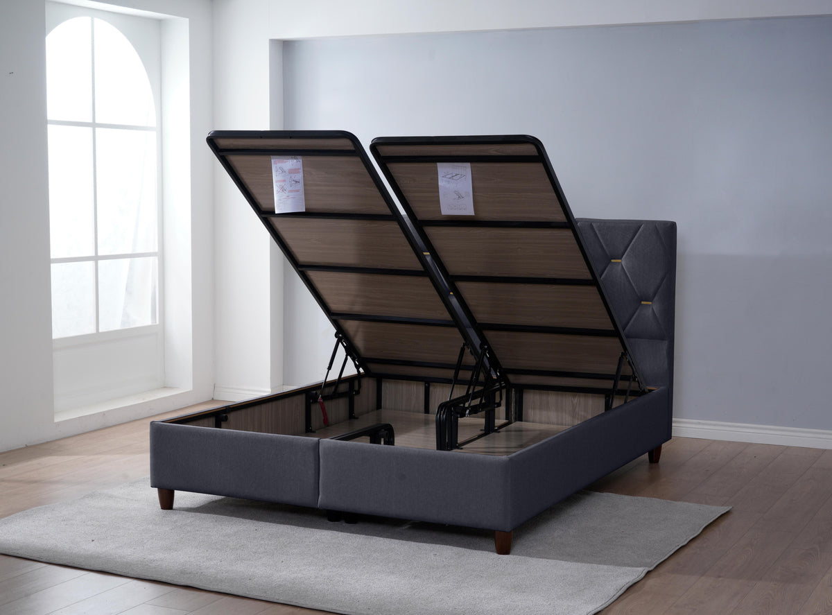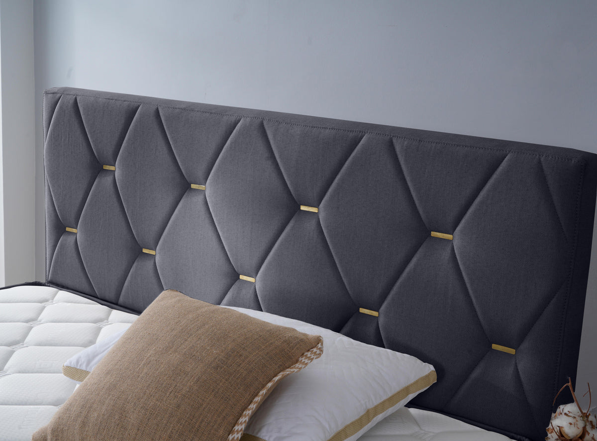 Designul modern, completat de tapiteria in nuanta antracit, aduce un aspect rafinat si usor de integrat in orice tip de decor. Tablia inalta, capitonata, adauga un plus de eleganta si sustinere, creand un punct de atractie in incapere.