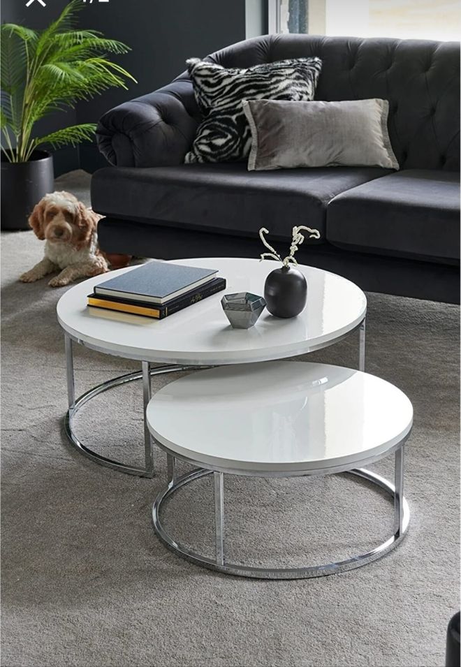 Adauga eleganta si luminozitate in livingul tau cu setul de masute de cafea Ara, disponibil la La Cucu. Cu un design modern si picioare metalice cromate, acest set cu 2 piese aduce un plus de rafinament si stralucire oricarui decor contemporan. Blaturile albe lucioase reflecta perfect lumina, creand senzatia unui spatiu mai deschis si aerisit.