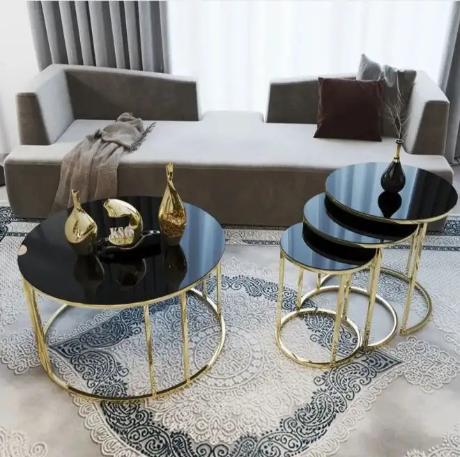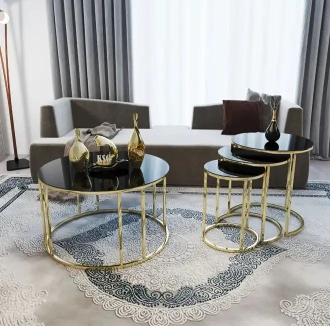 Transforma-ti livingul intr-un spatiu sofisticat cu setul de masute de cafea Laguna, o alegere ideala pentru cei care apreciaza designul modern si accentele luxoase. Cu o structura metalica aurie si blaturi negre din sticla securizata de 4 mm, acest set imbina eleganta, functionalitatea si siguranta intr-un mod desavarsit.