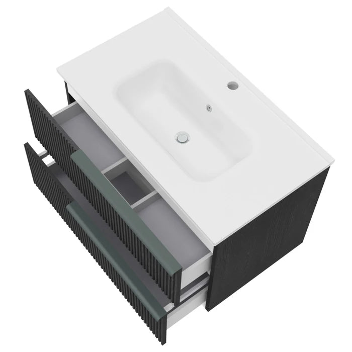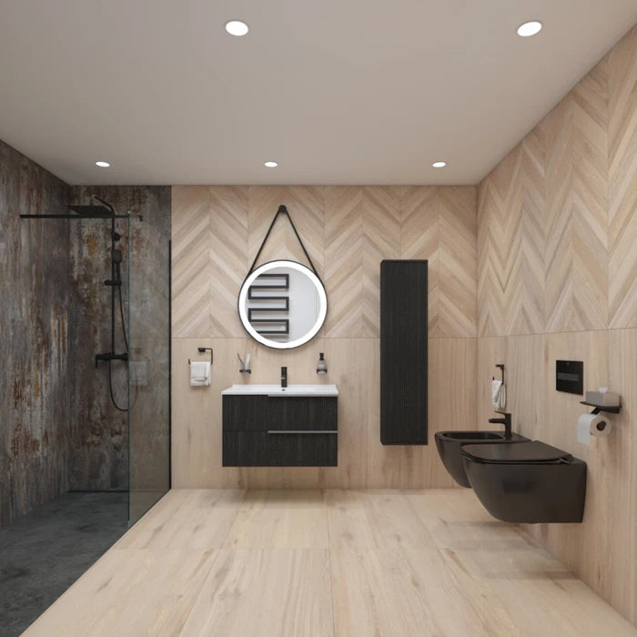 Setul de baie Savini Due Sidney 80 imbina perfect designul elegant cu functionalitatea moderna. Cu un finisaj negru mat si un lavoar alb din ceramica, acest set aduce un contrast rafinat si un aer sofisticat oricarei bai. Masca suspendata permite curatarea usoara a podelei si ofera un aspect aerisit, iar cele doua sertare incapatoare cu inchidere amortizata asigura organizarea eficienta a spatiului.