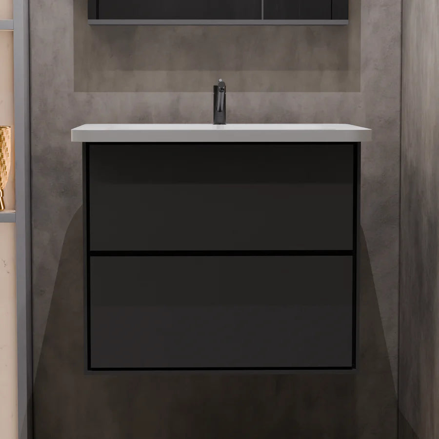 Baza suspendata, cu sertare spatioase si lavoar turnat, permite o curatare usoara a podelei si adauga un plus de confort si modernitate. Suprafata continua a lavoarului este usor de intretinut si ofera un aspect elegant si curat.